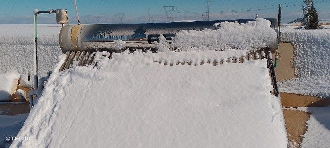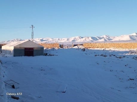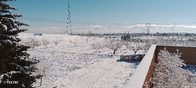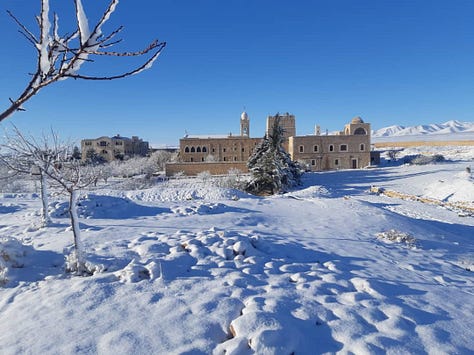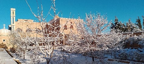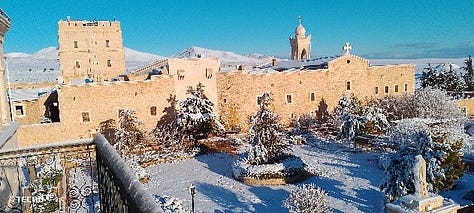 De nieuwbouw, het zusterklooster, het Sint Jozefsklooster, het terrein, het Anti-Libanongebergte… alles onder de sneeuw, ook de zonnepanelen.