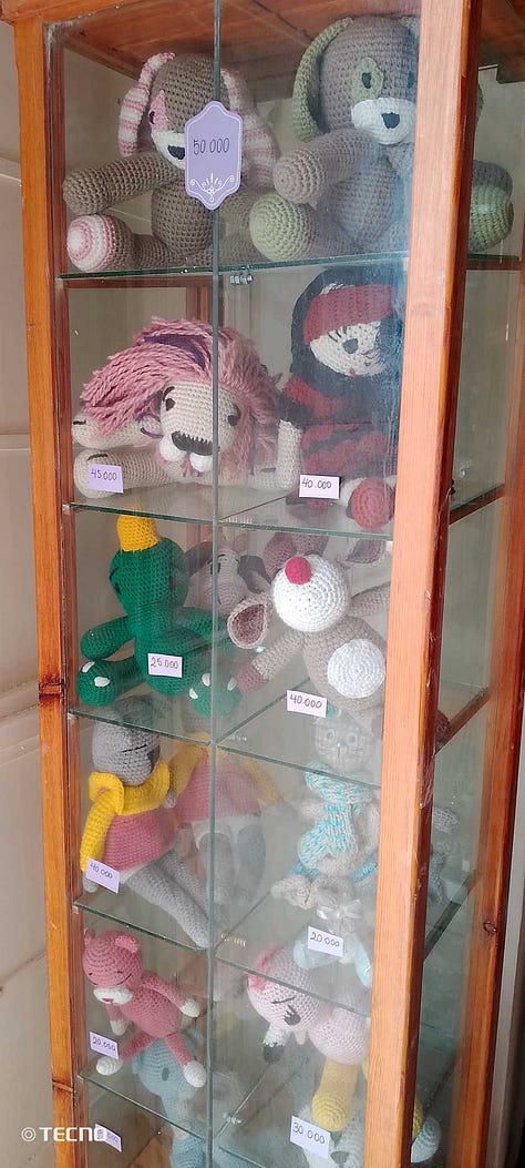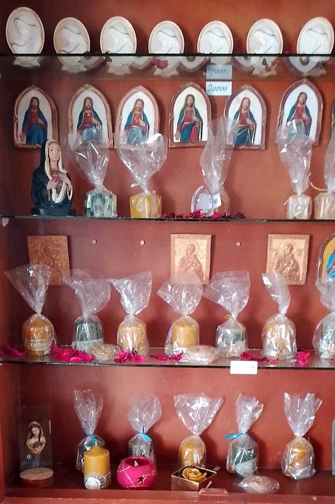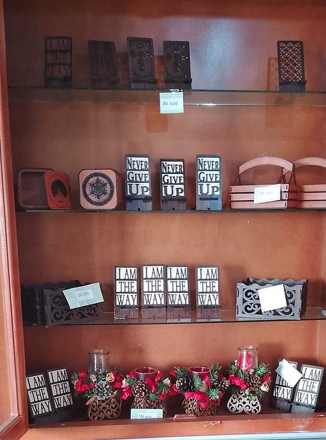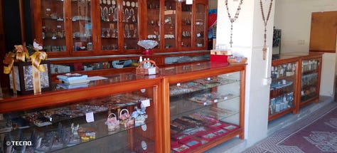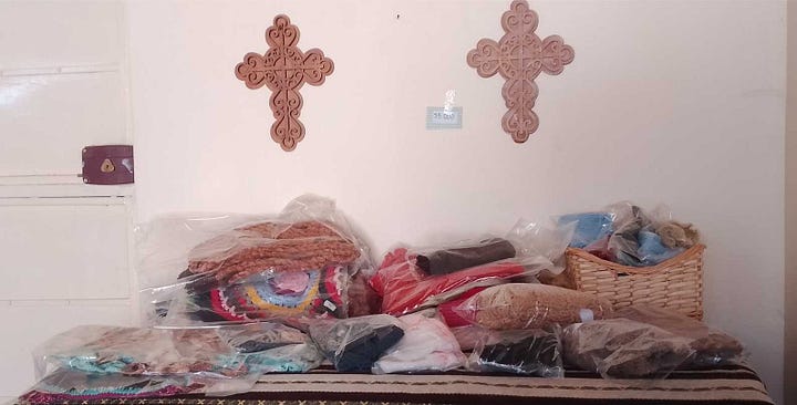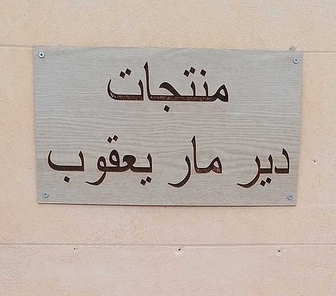 Ons souvenirwinkeltje richt zich vooral op toeristen uit het buitenland. Moentadjaat deir mar ya’qub = producten van het klooster van de heilige Jakob. Het helpt ons om zelf onderhoudend te worden. Vele Syriërs zijn arm en hebben zelf hulp nodig. We bieden eigen producten en religieuze voorwerpen aan: gedistilleerd water van rozen van Damascus, rozemarijn, lavendel, zalf van verschillende kruiden, abrikozenconfituur, rozenkransjes, armbandjes, oorringen, sierkaarsjes, sierdoosjes en -staanders, hand gebreide poppen, schoudertassen… Syriërs kunnen gratis een Arabisch Evangelie of religieus boek meenemen.